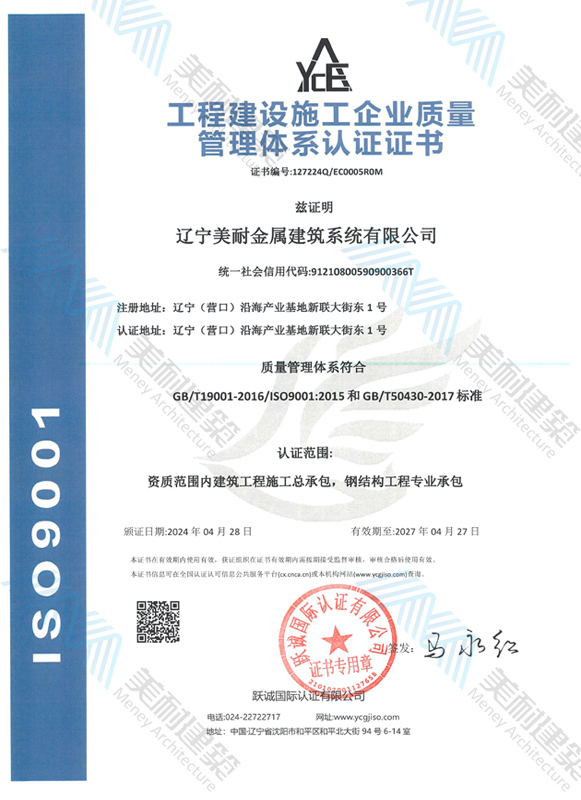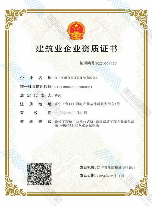 遼寧美耐金屬建筑系統(tǒng)有限公司位于遼寧(營口)沿海產(chǎn)業(yè)基地,專注于預(yù)制金屬建筑系統(tǒng)領(lǐng)域,是一家集工業(yè)建筑設(shè)計(jì)、制作、施工及相關(guān)的技術(shù)咨詢與服務(wù)為一體的綜合性服務(wù)企業(yè)。作為國家鋼結(jié)構(gòu)協(xié)會會員、中國建筑金屬結(jié)構(gòu)協(xié)會會員單位與國家高新技術(shù)企業(yè),美耐建筑集建筑工程施工總承包、鋼結(jié)構(gòu)工程專業(yè)承包等多種資質(zhì)于一身,并擁有22項(xiàng)鋼結(jié)構(gòu)建筑領(lǐng)域?qū)@?項(xiàng)軟件著作權(quán)。